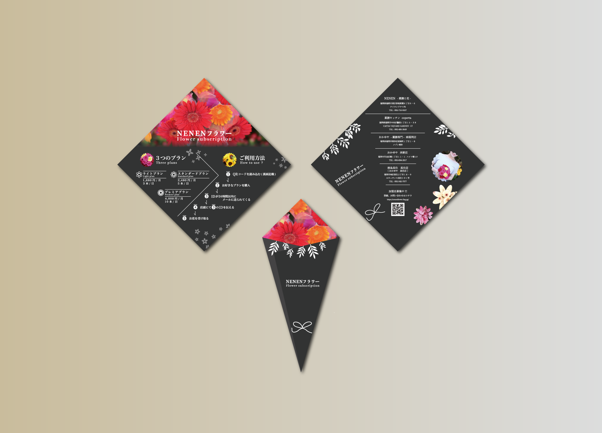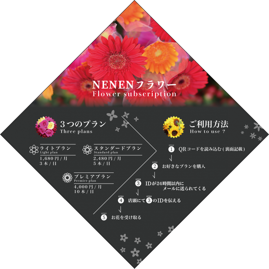 お花のサブスクの3つ折りパンフレットを制作させていただきました。